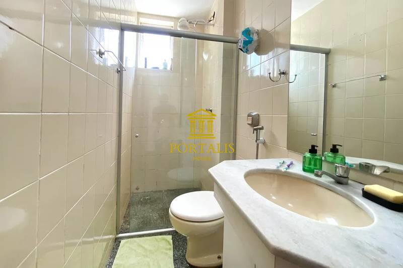 Banheiros (social e suíte) com armários, espelhos e box em blindex.