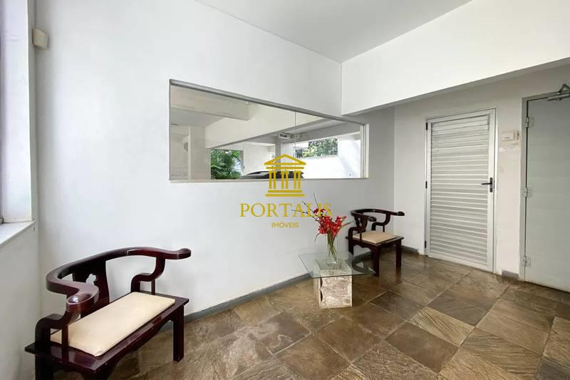 Edifício com hall social decorado, elevador com chave, salão de festas, área livre, cerca elétrica e sistema de segurança com câmeras e alarmes.