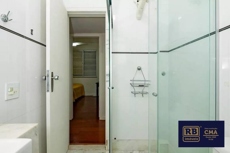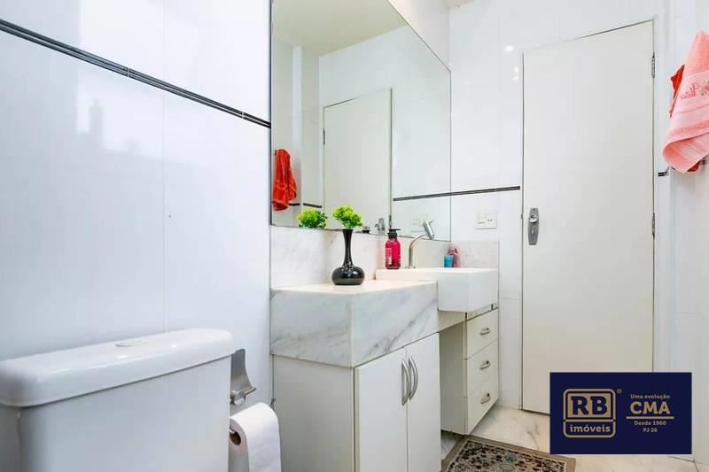 Banhos (social e suíte) com armários, espelho, bancada em mármore e box em blindex..