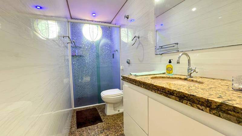 Banheiro social com bancada em granito, teto com rebaixamento em gesso, iluminação planejada, espelho, box em blindex e armários
