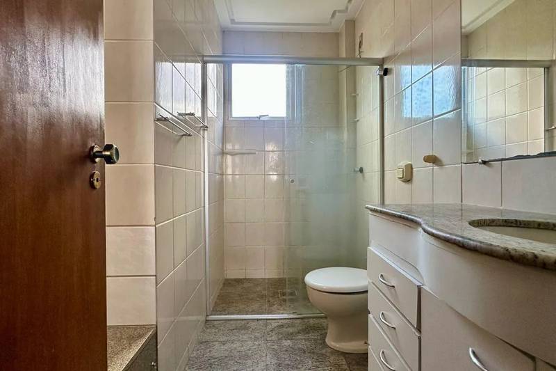 Banheiros das suítes com bancada em granito, armários, espelho e box em blindex.
