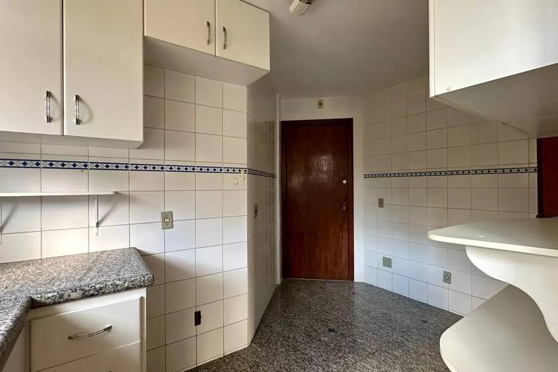 Cozinha espaçosa, com piso e bancadas em granito e armários.